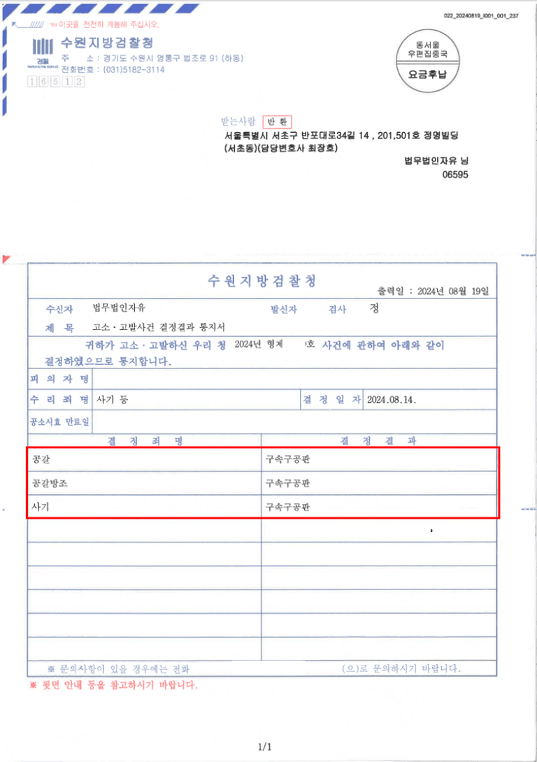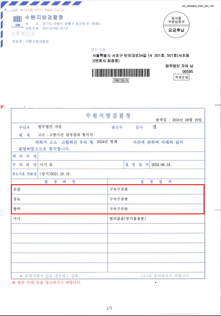A와 B는 자신들이 의뢰인으로부터 후원을 받은 것에 불과하다 주장하였기에, A와 B가 사회적으로 영향력이 큰 유튜버의 지위에 있으며, 후원이 아니라 사실상 공갈에 해당함을 적극 주장하였습니다. 또한, 의뢰인이 구치소에 수감 중인 상태였기 때문에 의뢰인을 신하여 이를 뒷받침할 수 있는 증거자료를 적극적으로 수집하여 검찰에 제출하였습니다. 그 결과 검찰은 A와 B에 대하여 구속영장을 청구하여 구속시킨 후, 공갈죄 등의 혐의로 기소하였습니다(구속구공판).