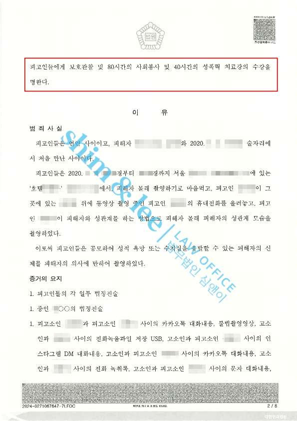 - 재판부는 결국 피고인들에게 징역 1년, 집행유예 2년, 보호관찰, 80시간 사회봉사, 성폭력 치료강의 40시간의 판결을 내려 심앤이의 손을 들어주었습니다.