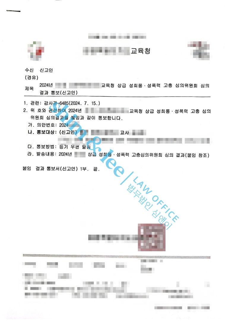 - 의뢰인이 남성이기 때문에 통계나 사회적 맥락에 따라 다른 일반적인 직장내 성범죄 사건보다 상대적으로 경하게 보일 수 있어 주의를 요하는 사건이었고, 의뢰인께서 심의위원회에 출석하여 진술하는 것에 큰 부담을 느끼고 계신 상황이었습니다.