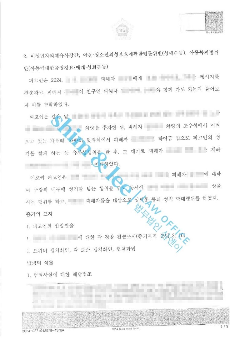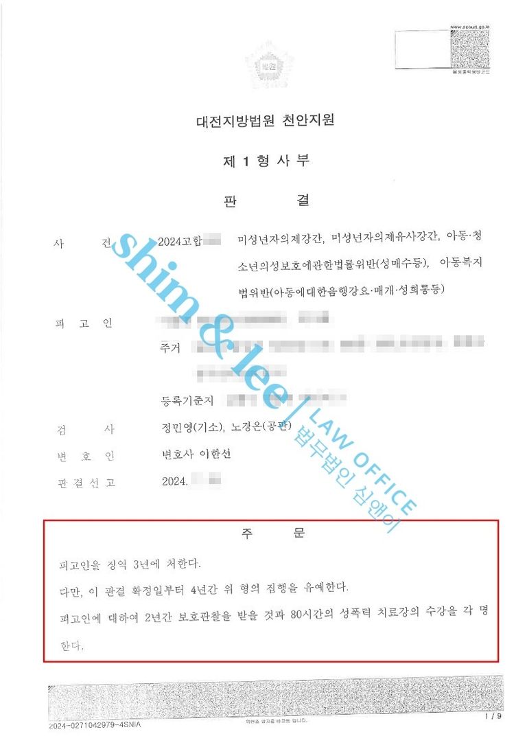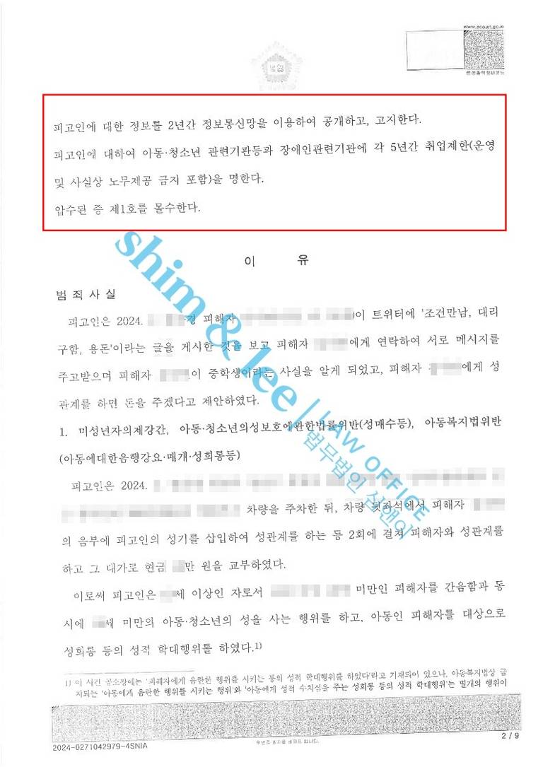 - 고액으로 합의를 하였음에도 평소에 쉽게 인정되지 않던 가해자 신상공개, 보호관찰처분까지 전부 인용되어 매우 뿌듯한 결과였습니다. SNS가 발달하며 아동청소년들을 대상으로 사이버 성범죄가 기승을 부리고 있는데, 오늘 사례처럼 미성년자 대상 성범죄의 경우 형량이 매우 높아지고 있으니 말못할 피해를 입은 피해 아동이 있다면 가족분들과 용기 내어 고소하시기를 추천드립니다.