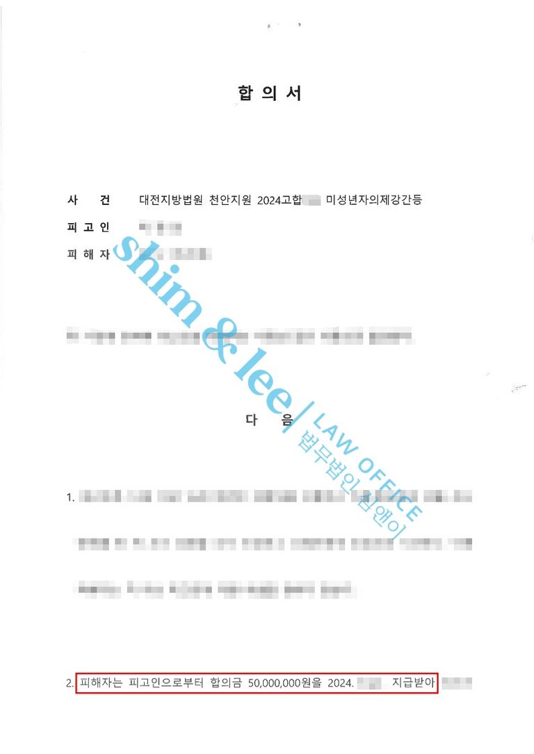 3. 재판 단계에서 마침내 가해자는 공소사실과 증거에 대해 모두 인정하며 합의를 요청해왔습니다. 대표 변호사님이 합의를 직접 담당하며 가해자의 평소 성정, 보복 가능성, 진실된 반성의 의사를 확인해 피해자 가족분들에게 전달드렸고, 의뢰인들께서 원하시는대로 피해자 가족에 대한 접근 금지, 거주 이전, 보복 금지 등의 구체적인 합의 조항과 함께 최종 5천만 원이라는 높은 합의금을 이끌어냈습니다.