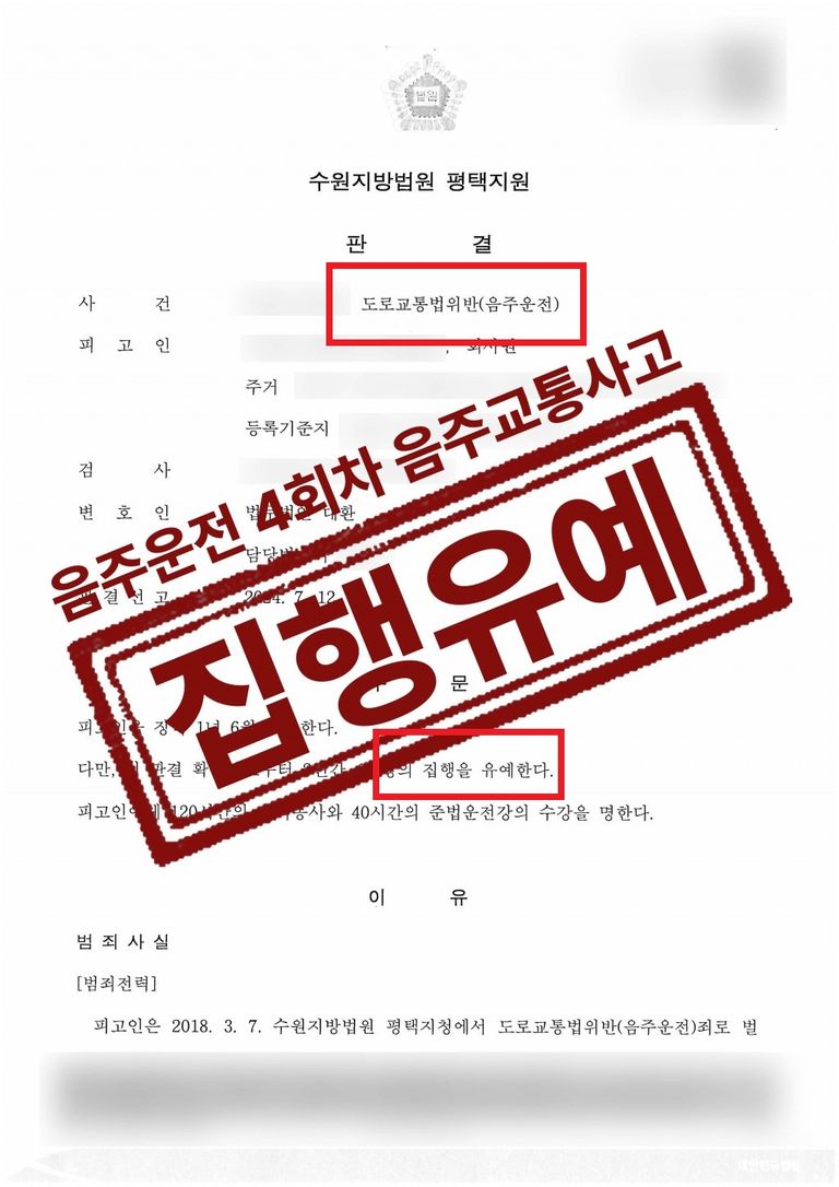 법무법인 대환은 수사단계에서 피해차량의 피해정도와 피해자의 부상정도가 미미함을 주장하여 도로교통법위반(사고후미조치), 특가법위반(도주치상)을 제외하고 도로교통법위반(음주운전)죄만으로 기소되었으며, 의뢰인에게 유리한 정상으로 참작될 수 있을 만한 양형사유들을 의뢰인으로 하여금 수사단계에서부터 준비하게 하고 이를 변호인의견서로 잘 소명하여 결국 형사재판에서 집행유예 판결을 이끌어낸 사건입니다.