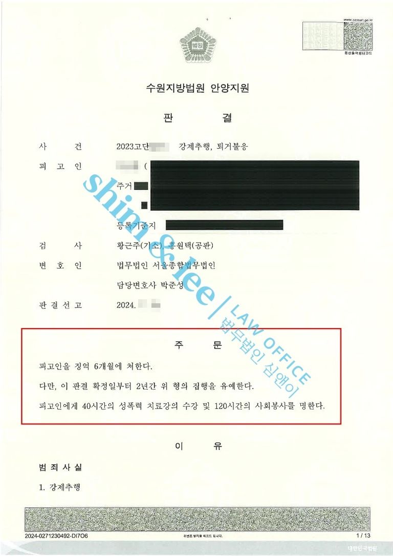 - 결국 재판부 역시 피해자의 손을 들어주었고, 강제추행, 퇴거불응 전부 유죄로 인정받을 수 있었습니다.