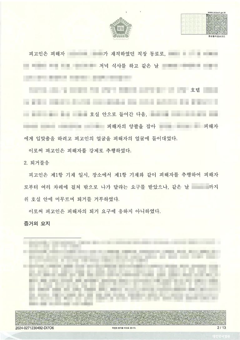 - 가해자는 의뢰인과 오래된 직장 동료이자 의뢰인이 결혼하여 가정이 있다는 사실을 알면서도 의뢰인이 취해 보여 안전하게 데려다 준다는 핑계로 호텔까지 동행하였고, 방 앞에서 인사하려는 의뢰인의 말을 무시하고 막무가내로 방 안까지 들어와 양팔을 잡아당겨 의뢰인을 침대에 앉히고 억지로 스킨십을 시도하려고 하였습니다.