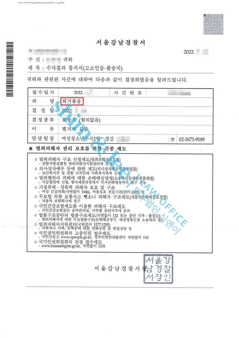 최초 경찰은 강제추행을 미수로 인정하고, 퇴거불응에 대하여는 불송치 결정을 내렸습니다.