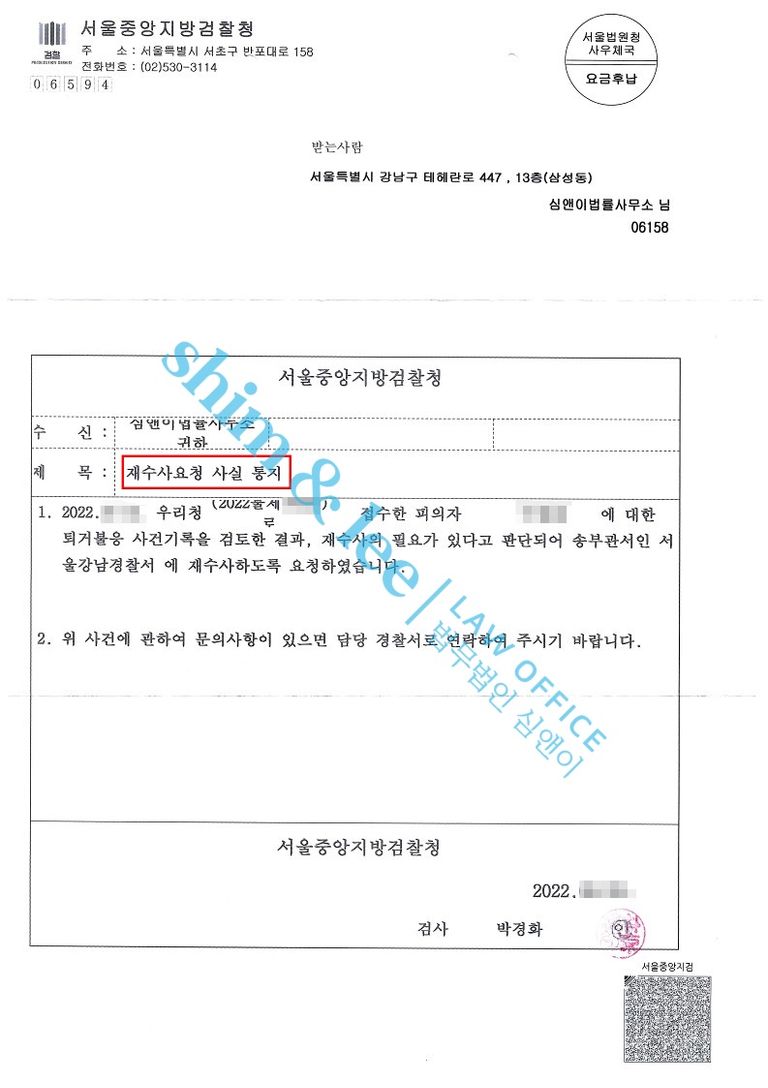 2. 또한, 증거불충분으로 불송치될 뻔한 퇴거불응 건에 대하여도 피해자가 수차례 퇴거를 요청했다는 점을 근거로 변호사 의견서를 작성하여 지속적으로 모든 혐의를 인정시키기 위한 노력을 이어나갔습니다. 검사실과 지속적으로 소통하며 재수사가 필요하다는 점을 어필하였고, 마침내 검찰은 경찰의 수사가 미진하고 관련 법리를 잘못 해석했다는 이유로 불송치 결정에 대한 재수사를 요청하였습니다.