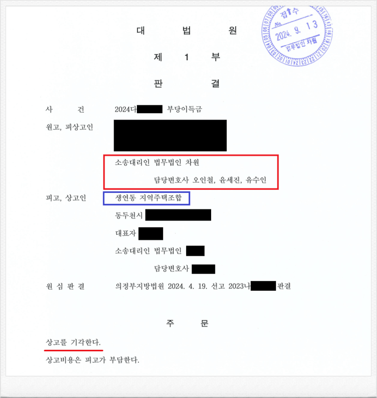 이번에도 재판부는 저의 주장을 받아들여, 생연동 지역주택조합 측의 상고를 기각하였고, 결국 지역주택조합 분담금 반환 소송 대법원 최종 승소 판결을 이끌어 내었습니다.