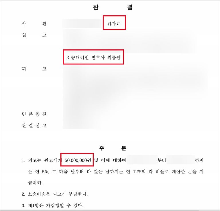 법원은 최동원 변호사의 청구금액 5천만 원 전부를 인정했습니다. 상간소송 위자료 금액으로는 매우 이례적인 성공사례였습니다. 최동원 변호사의 상담 창구는 언제든 열려있으니 편하게 연락 주시기 바랍니다.