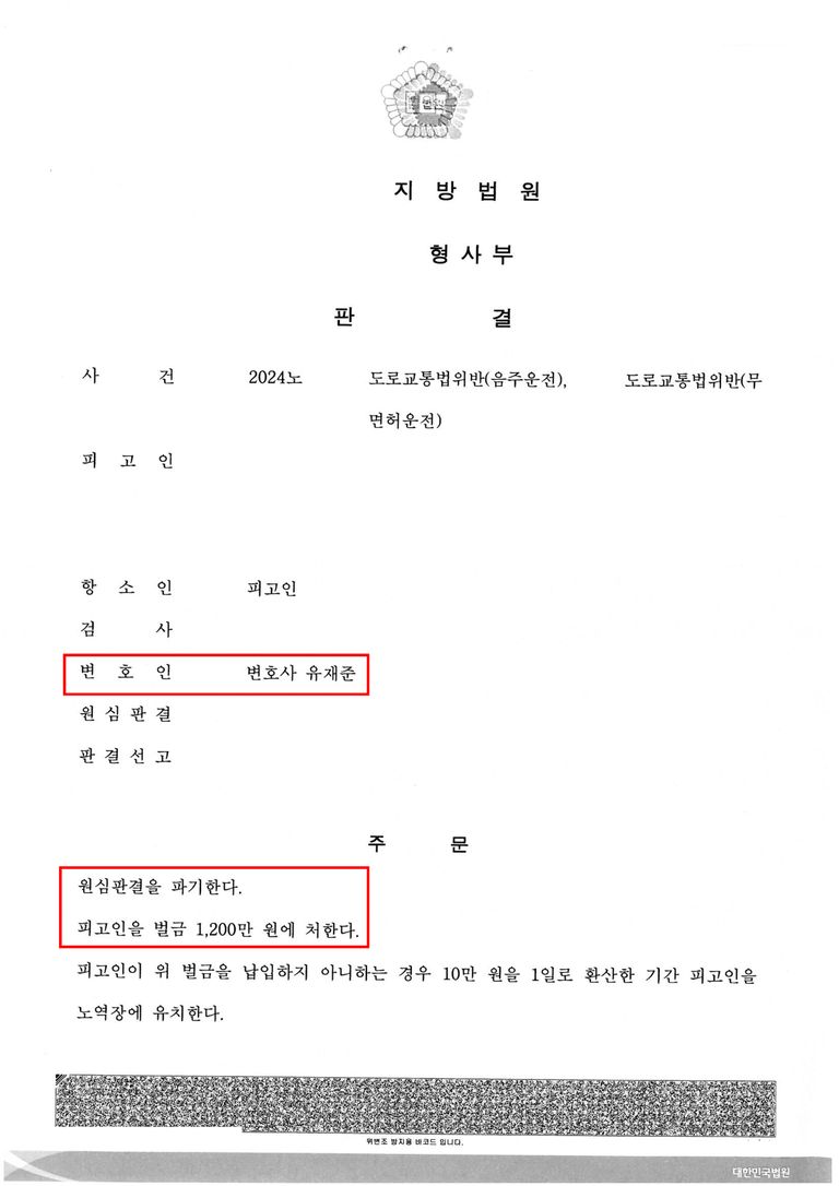○ 사건개요: 의뢰인은 이미 음주운전 범행을 2차례 범하였고 기존의 음주운전 집행유예 기간 도중에 다시 음주운전 및 무면허운전 범행을 범하여 일명 '3진 아웃'의 상황에 처하여 1심에서 징역 6개월을 선고받았으나, 본 변호사를 만나 항소심에서 벌금 1,200만 원을 선고받음으로써 감형에 성공하고 구치소에서 퇴소한 사례