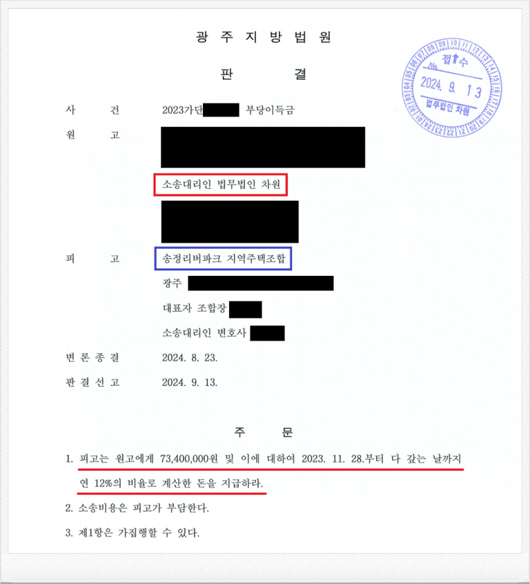 결국, 재판부는 이러한 저의 주장을 받아들였고, 피고는 의뢰인에게 73,400,000원 및 이에 대한 지연손해금을 지급하라는 내용의 판결을 이끌어 내었습니다.