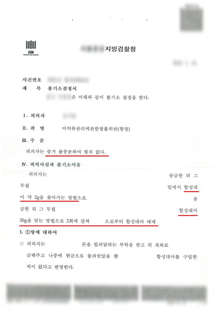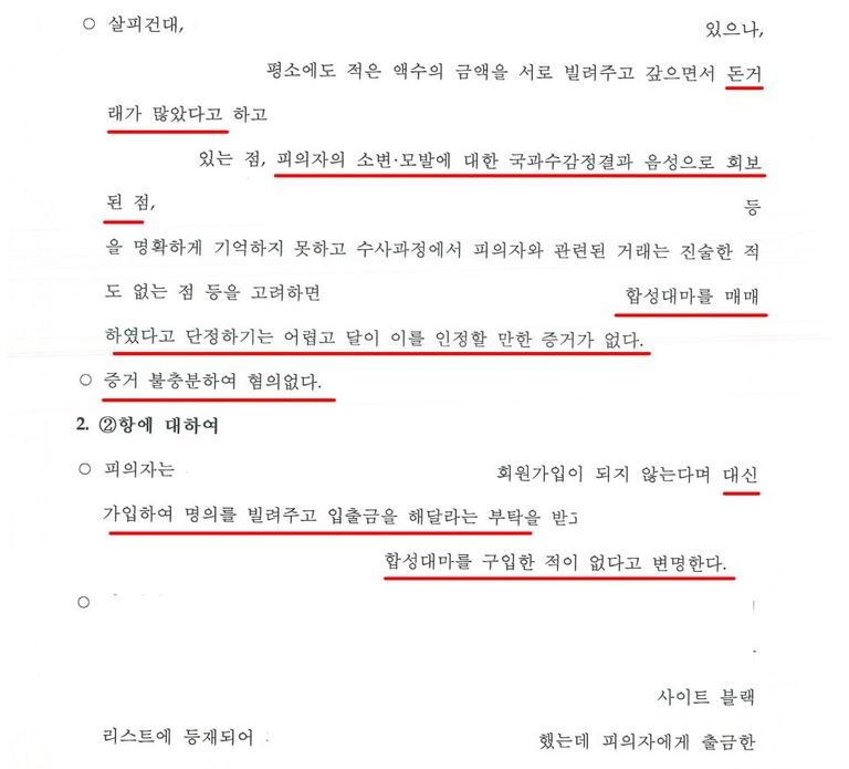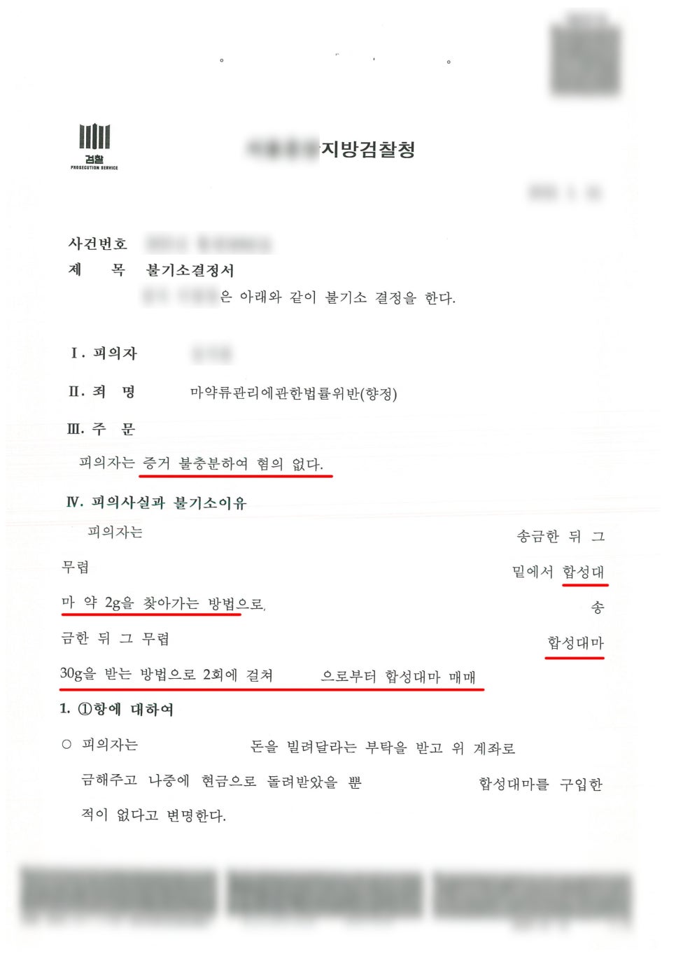 그런 뒤 저는 A씨와 B씨가 주고받은 계좌 이체 내역, A씨와 B씨가 주고받은 메시지 내용 등 여러 객관적인 자료를 바탕으로, A씨는 B씨의 요구에 돈을 빌려주었을 뿐이라는 점, A씨는 소변·모발 검사에서 '음성'으로 나왔다는 점, 판매책은 A씨에게 합성대마를 판매한 사실에 대해서 기억하지 못하고 있다는 점, B씨가 A씨의 명의·계좌로 도박 사이트 가입을 요구하자, A씨는 B씨의 요구에 응해 도박 사이트에 가입해 주었으며 B씨로부터 계좌로 받은 돈을 게임머니로 충전해 주고 B씨가 게임을 하면서 딴 돈을 B씨의 계좌로 보내주었을 뿐이라는 점 등을 적극적으로 어필하면서 '이 사건 당시 A씨는 합성대마를 구매한 사실이 전혀 없다'는 내용의 변호인의견서를 수사기관에 수차례 제출하였습니다.