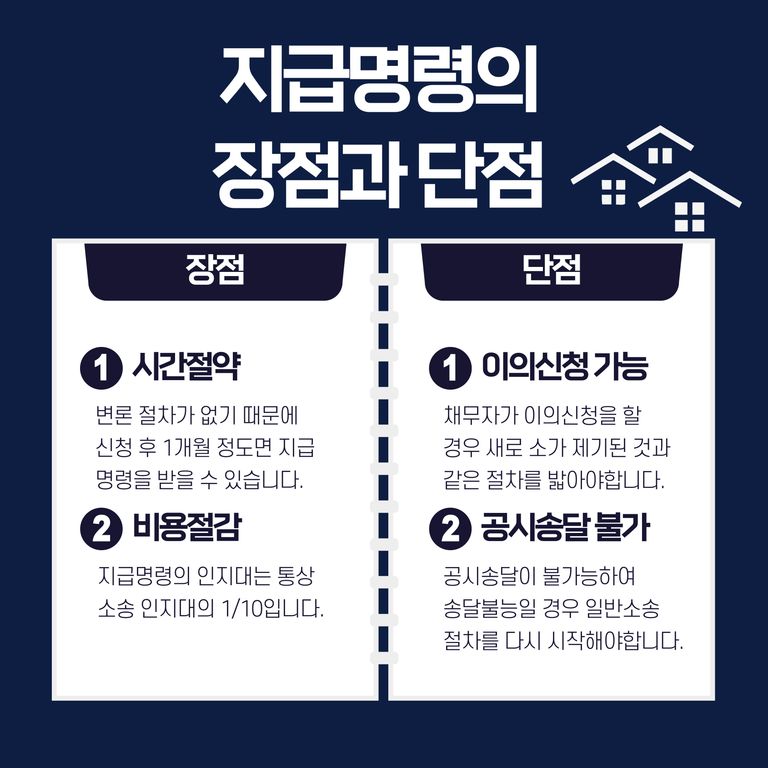 지급명령은 보증금반환소송과 같은 소송절차를 거치는 것보다 법원비용이 훨씬 저렴합니다. 통상 소송에서 드는 인지대의 1/10 정도의 금액으로 절차를 밟을 수 있기 때문에 소송이 부담스러운 경우 많이 이용하는 제도입니다.