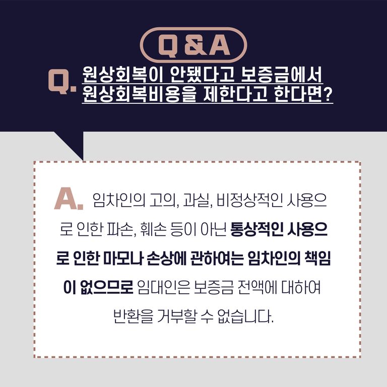 세입자가 임차한 집에 훼손이 발생했다는 이유로 보증금을 돌려주지 않거나 일부만 돌려주겠다고 하는 등 원상회복 비용을 두고도 분쟁이 일어나기도 합니다. 임대차 계약에서 원상회복 비용을 청구하는 것은 임대인의 권리 중 하나입니다.