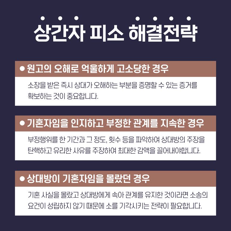상간자 소송을 당하면 보통 대응 방법을 몰라 당황하시는 경우가 많습니다. 또한 이러한 소송은 사회적 명예나 시선과 밀접한 부분이기 때문에 더욱 스트레스를 받게되곤 합니다. 이런 상황에서는 전문 변호사의 도움을 얻어 현실적인 방어전략을 세워서 침착하게 대응하시는 것이 더욱 바람직할 것입니다.