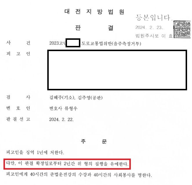법원은 최종적으로 징역 1년, 집행유예 2년의 형을 선고하였습니다.