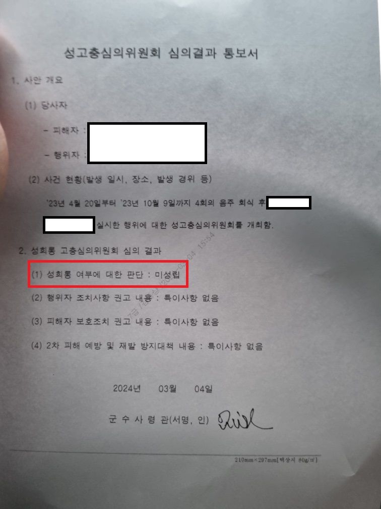 상대방은 의뢰인과 동의 하에 성적 행위를 하였음에도 의뢰인과 사이가 멀어지자 허위 신고를 단행하였습니다. 한편 상대방은 의뢰인을 형사 고소하지 않았고, 군내 ‘성희롱 신고’로 신고한바, 본 사건은 군내 성고충심의위원회의 심의를 받게 되었습니다.