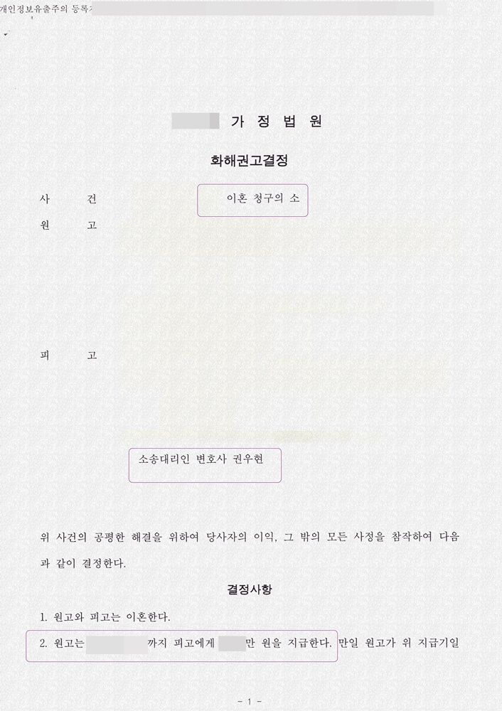 그에 따른 재산분할금을 받고 나오신 남자분이 아내가 이혼만 청구하는 내용의 소장을 들고 왔다.