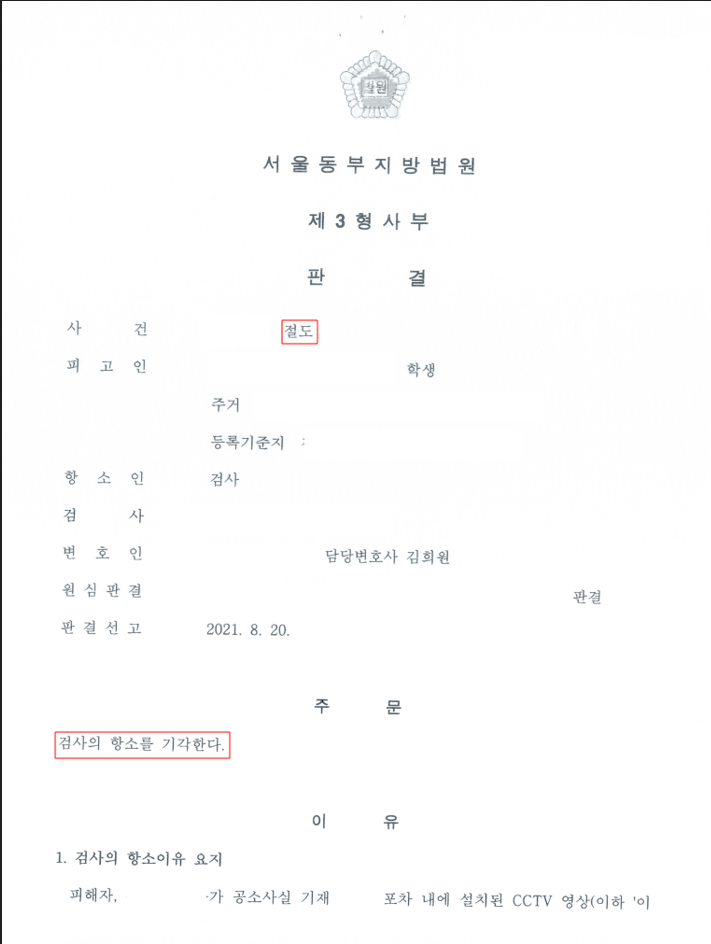 항소심 재판부는 이러한 저의 주장을 받아들여, 1심에서와 같이 피고인에 대해서 그 절도 혐의에 대해 입증이 부족하다며 무죄 판단을 하며, 검사의 항소를 기각하였습니다.