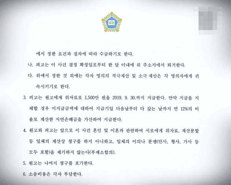 재산분할 없는 이혼 결정, 아내 측이 청구한 위자료 5천만 원 중 1천5백만 원 인정