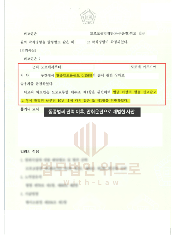 음주운전 재범인 사안인 만큼, 의뢰인은 곧바로 위드로에 사건을 의뢰했고 김경환 검사출신변호사는 상담 내용을 토대로 수사/재판 조력을 진행했습니다.