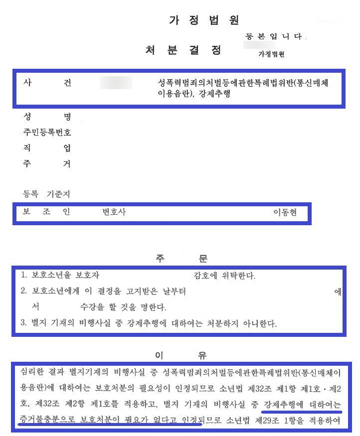 결국 이러한 주장을 받아들여, 법원은 A군에게 '강제추행에 대해서 불처분, 통신매체이용음란에 대해서 1, 2호 처분'을 내렸습니다.
