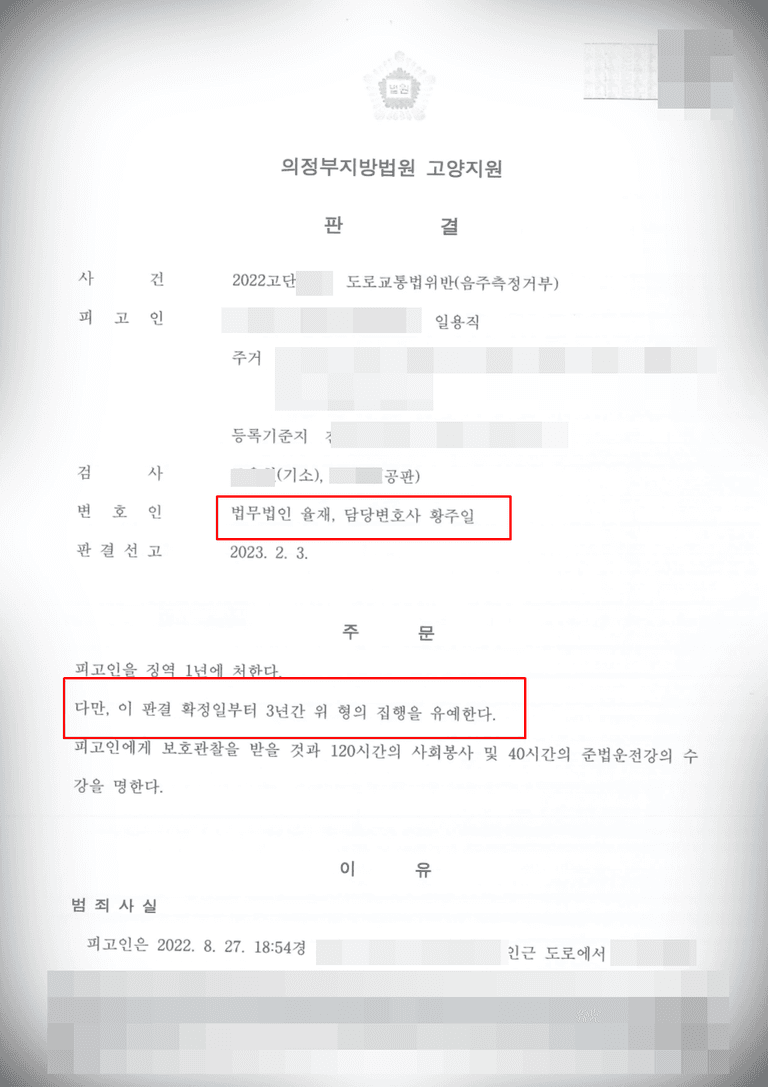같은 음주운전 사건이라고 하더라도 각각의 사건마다 그 내용은 모두 다르기 마련입니다. 본 사건 역시 저희 율재의 수많은 음주운전 사건 해결 경험과 노하우를 바탕으로 의뢰인이 법의 테두리 안에서 최대한 선처를 받을 수 있도록 조력하여 좋은 결과를 얻을 수 있었습니다.