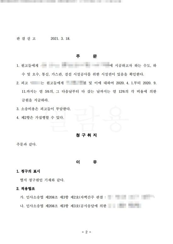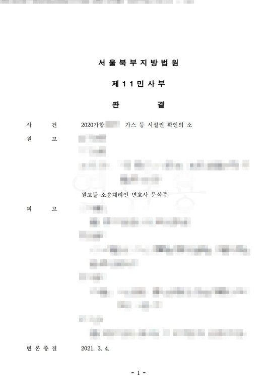 피고들은 원고의 소장을 송달 받은 후 본인들에게 승산이 없음을 인정하여 특별한 대응을 하지 않았고 이에 의뢰인은 코로나임에도 불구하고 비교적 빠른 확정판결을 받아 신축 주택에 가스관을 연결할 수 있었습니다.