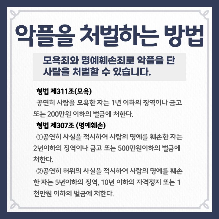 이러한 악플은 모욕죄, 혹은 명예훼손죄로 처벌할 수 있는데요.