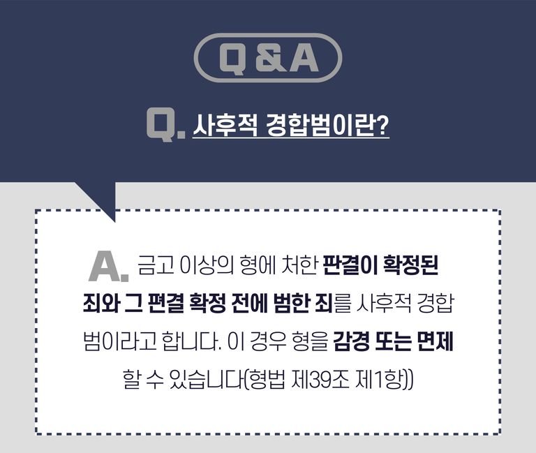 이때 사후적 경합범이란 금고 이상의 형(집행유예 포함)이 선고되고 판결이 확정된 후, 그 판결 확정 이전에 범한 죄를 뜻합니다.