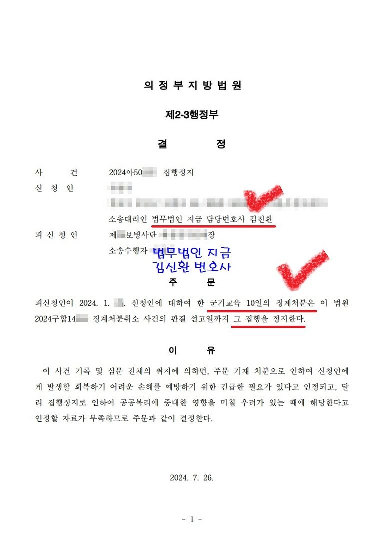 이상 군기교육 징계처분에 대해 집행정지 결정을 받아 군기교육 집행이 되지 않고 최근 전역하게 된 병사의 성공사례를 소개해 드렸습니다.