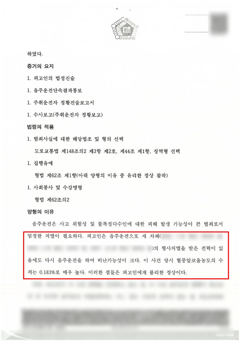 2. 혈중알콜농도도 0.183%으로 실형 가능성이 높았던 사건.
