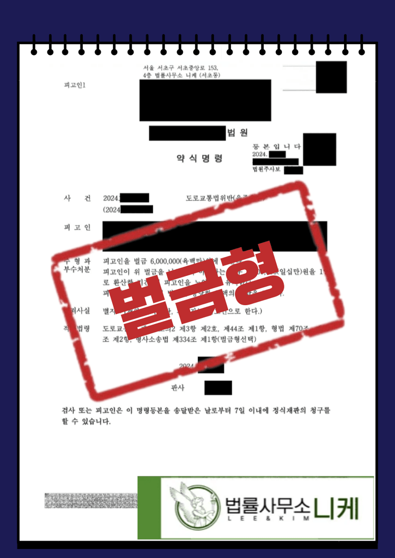 그 결과 의뢰인은 도로교통법위반(음주운전) 혐의를 받고 법정형으로 최소 벌금형 최대 2년 이하의 징역형을 선고받을 수 있었음에도 불구하고 벌금형 처분으로 끝날 수 있었습니다.