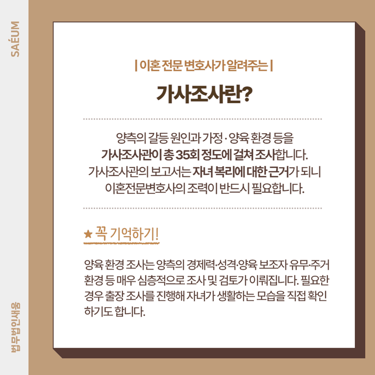 양육권 분쟁이 발생했을 때, 재판장이 아닌 가사조사관이 한 달 평균 12회, 총 35회 정도 조사를 시행합니다. 이때 양육 환경 조사도 함께 이루어집니다.