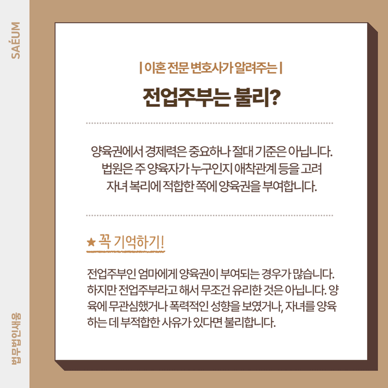 오히려 전업주부인 엄마에게 양육권이 부여되는 경우가 많습니다. 법원은 주 양육자가 누구인지, 부모와 자녀 간 애착 관계가 어떤지를 고려하여 자녀의 복리에 적합한 쪽에게 양육권을 부여하기 때문입니다.