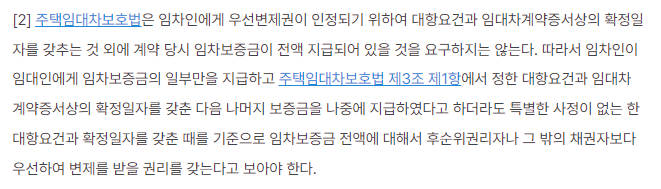 판례에 의하면 우선변제권도 대항요건과 확정일자를 갖춘 때를 기준으로 봅니다. 보증금 전액을 지급 안 했어도, 전액에 대한 우선변제권이 있다는 것입니다. 계약금, 중도금 외에 미지급한 잔금까지 전액 보호가 된다는 것이 핵심입니다.