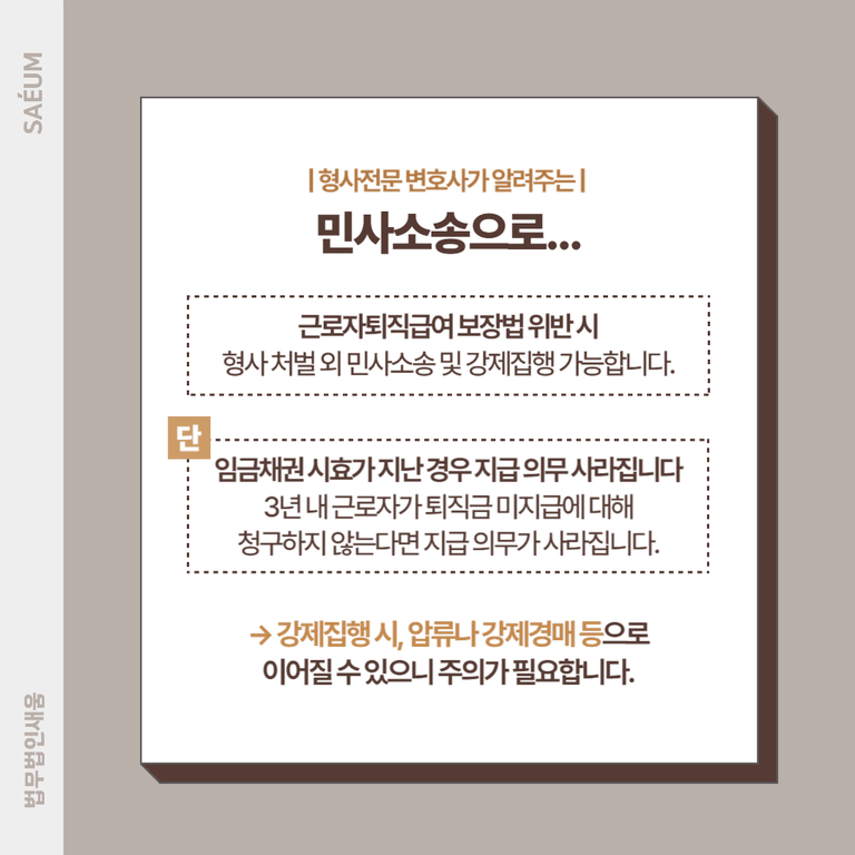 다만 모든 상황에서 및 민사소송이 진행되는 것은 아닌데요. 임금채권의 시효는 3년으로 일반적인 채권 시효보다는 짧은 편이기 때문에 3년 내로 근로자가 퇴직금 미지급에 대해 청구하지 않는다면 지급 의무가 사라지게 됩니다. 따라서 소송이 진행되었을 때는 기한이 지난 것은 아닌지 살펴보고, 합당한 대응을 할 수 있도록 해야 합니다.