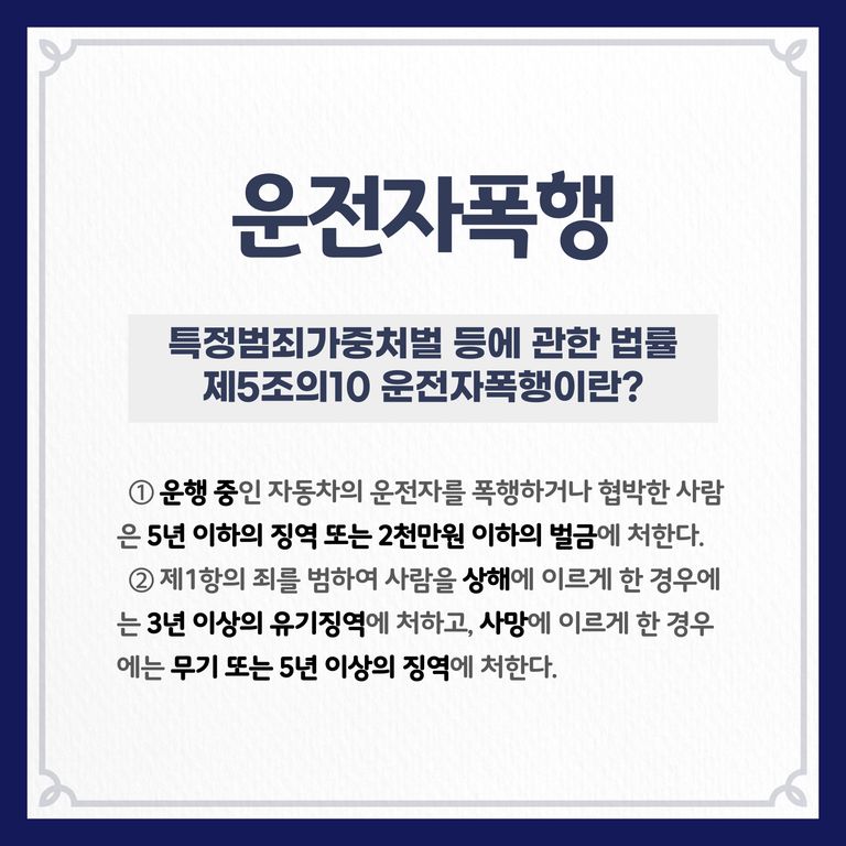 이번 포스팅에서는 특정범죄 가중처벌 등에 관한 법률의 운전자폭행에 대해 이야기해보려고 합니다.