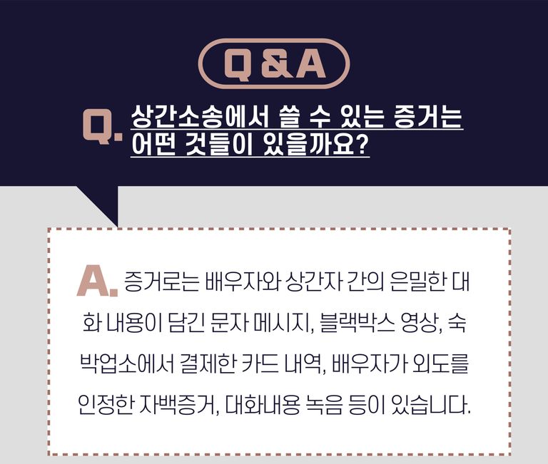 이때 증거로 사용할 수 있는 유효한 증거로는 배우자와 상간가 주고받은 문자메시지, CCTV 영상, 사진, 동영상, 카드 결제 내역, 차량 운행 기록, 영수증, 차량 블랙박스 영상 등 다양합니다.