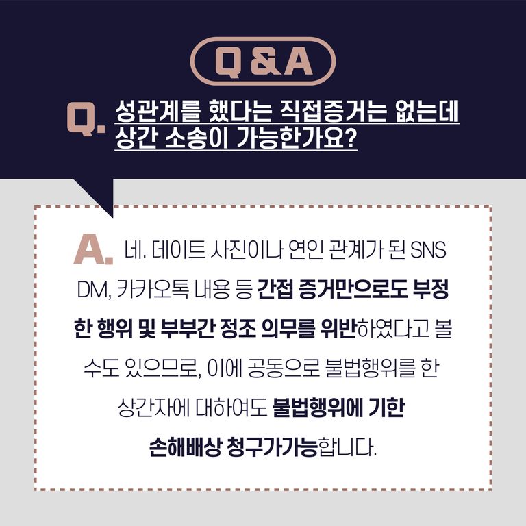 그러나 대법원은 부정한 행위의 범위를 간통의 개념보다 넓게 평가하고 있기에, 상간자와 배우자의 성관계에 대한 직접적인 증거가 없다고 하더라도 서로 다정하게 나눈 카카오톡 내용, SNS DM 내용, 함께 데이트하는 사진 등의 간접 증거만으로도 부정한 행위 및 부부간 정조 의무를 위반하였다고 볼 수도 있으므로, 이에 공동으로 불법행위를 한 상간자에 대하여도 불법행위에 기한 손해배상 청구가 가능합니다.