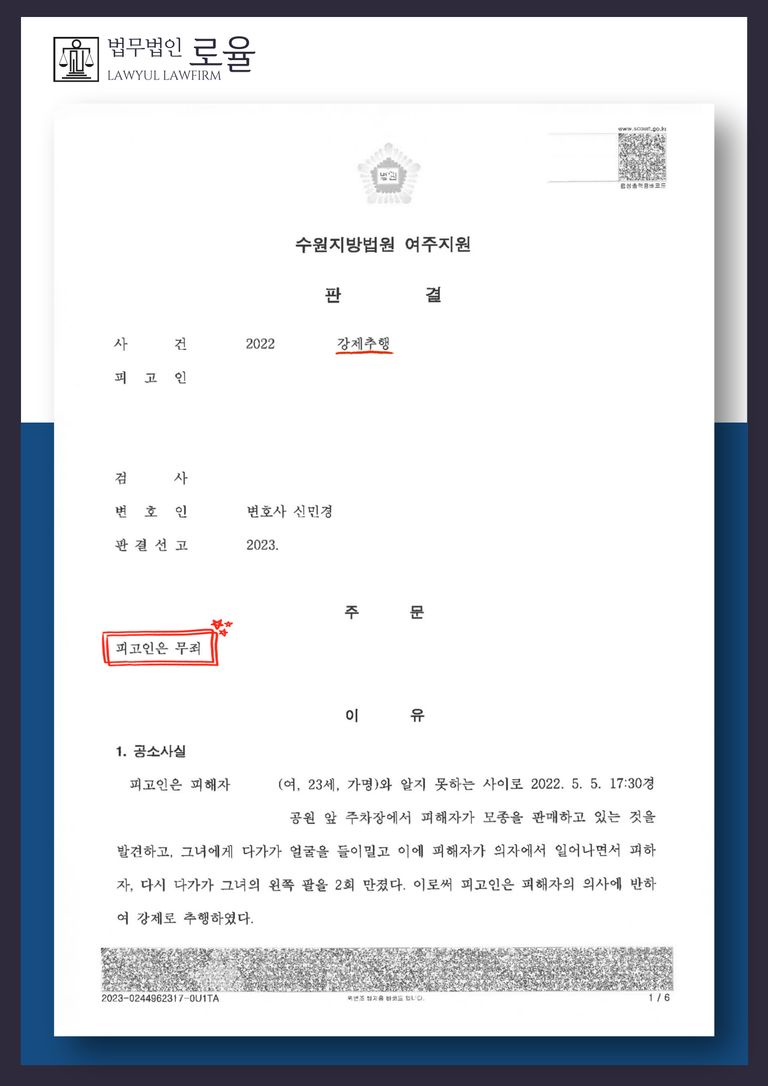 법무법인 로율 대표변호사 이동언 변호사와 신민경 변호사의 빈틈없는 주장으로 이 사건은 최종적으로 무죄 판결을 이끌어낼 수 있었습니다.