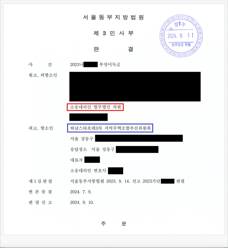 그러나 이와 같은 법원의 판결에도 피고 하남스타포레3차 지역주택조합 추진위원회 측은 패소를 인정하지 못하고, 항소하였습니다.