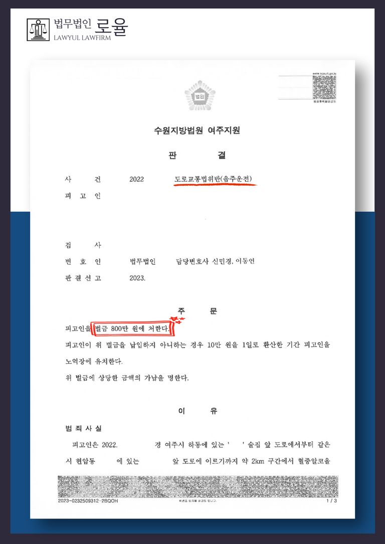 법무법인 로율의 이동언 대표변호사와 신민경 변호사의 빈틈없는 주장을 통해 재판부를 설득할 수 있었고, 이 사건은 실형이 아닌 벌금 800만원이라는 판결을 이끌어낼 수 있었습니다.