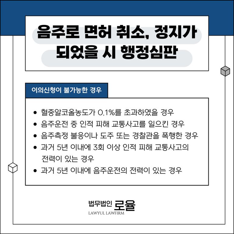 이러한 행정심판을 통한 이의신청은 취소처분을 받은 날로부터 60일 이내에 제기하여야 하며, 신청할 수 있는 자격 및 기준이 도로교통법 시행규칙에 의해 자세하게 정해져있습니다.