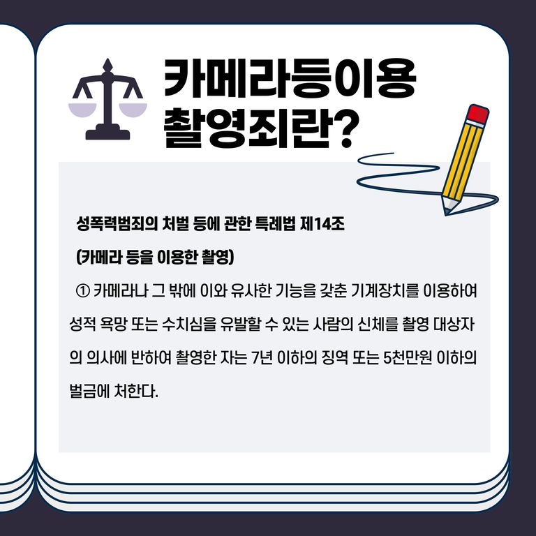불법촬영이란 성폭력범죄의 처벌 등에 관한 특례법 제14조(카메라 등을 이용한 촬영)로 처벌하고있는 범죄입니다.