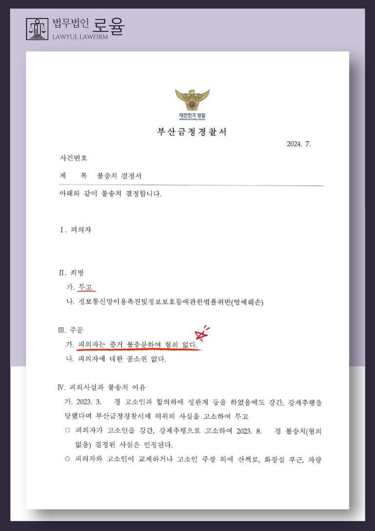 그러나 불행히도 증거가 없다는 이유로 사건은 불송치되었고, 불송치 결정이 나오자 상대는 바로 무고죄로 의뢰인을 고소하였습니다.
