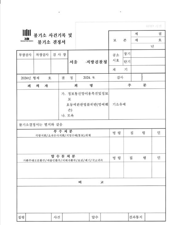 검찰은 변호인의 의견을 적극 수용하여 정통망법위반(명예훼손)죄와 모욕죄 모두에 대해 기소유예 결정을 하였습니다.