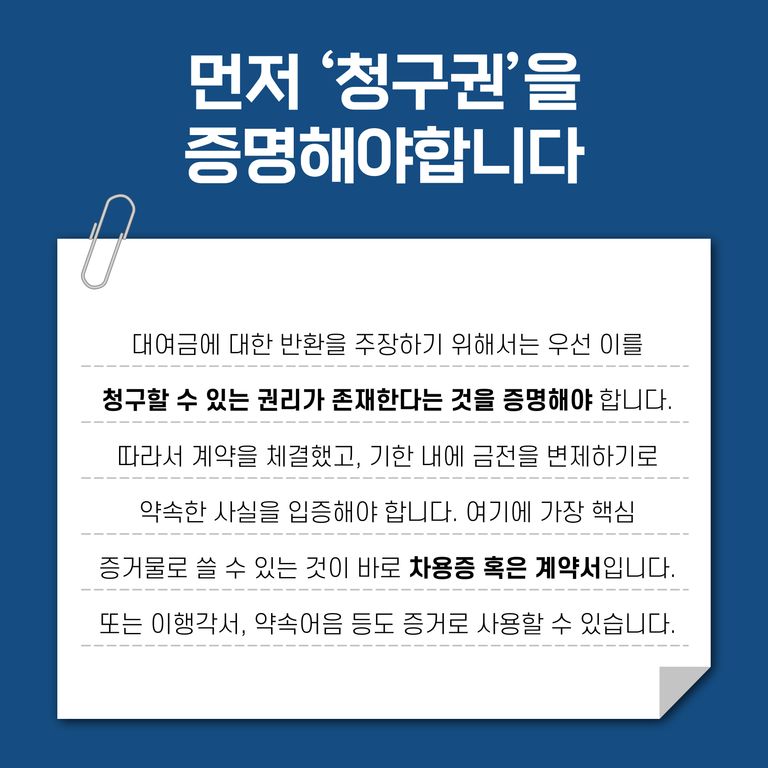 대여금 반환 문제를 법적으로 해결하려면 우선 대여금을 돌려받을 권리가 있다는 것을 법적으로 증명해야하는데요.
