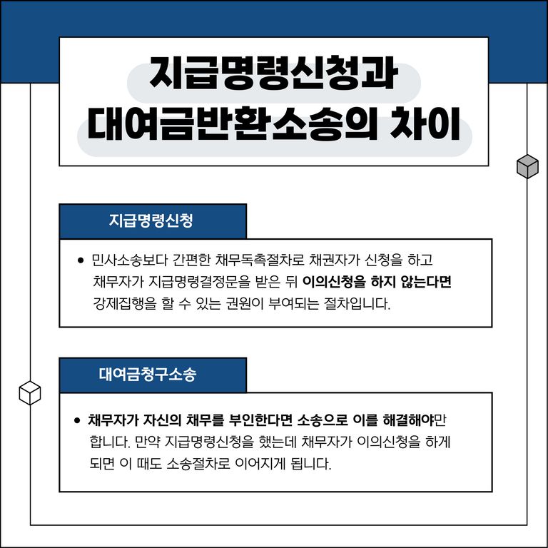 지급명령신청은 본 소송보다 훨씬 빠르게 절차가 진행되며, 재판 비용 또한 절감되기 때문에 본 소송이 부담스러운 경우 많이 이용하는 제도입니다.