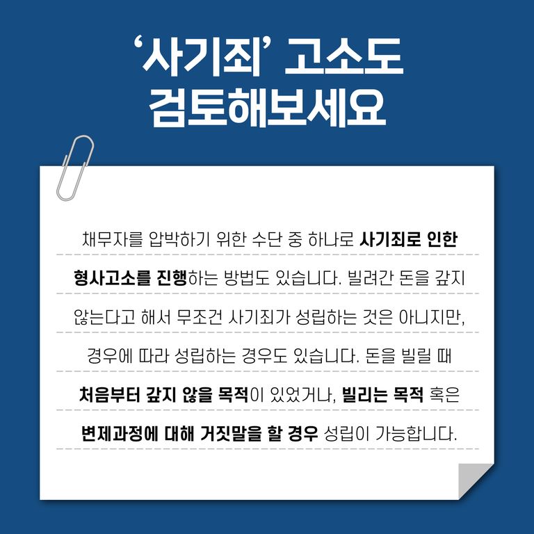 돈을 돌려받지 못하여 가압류 혹은 민사소송을 통해 채무자를 압박하는 수단보다 사기로 형사고소를 진행하는 것이 더 효과적인 경우가 있습니다.
