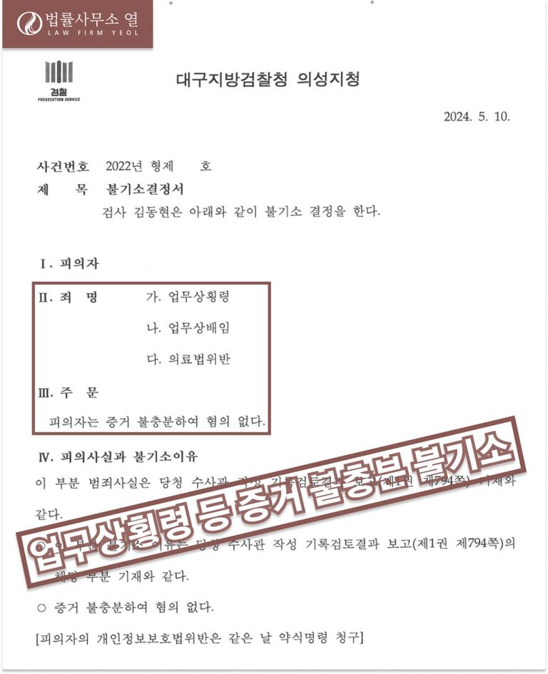 오늘은 업무상횡령, 업무상배임, 의료법위반 혐의로 기소된 의뢰인을 대리하여 증거불충분 무혐의 처분을 받아내어 방어한 사례를 소개해 드리겠습니다.